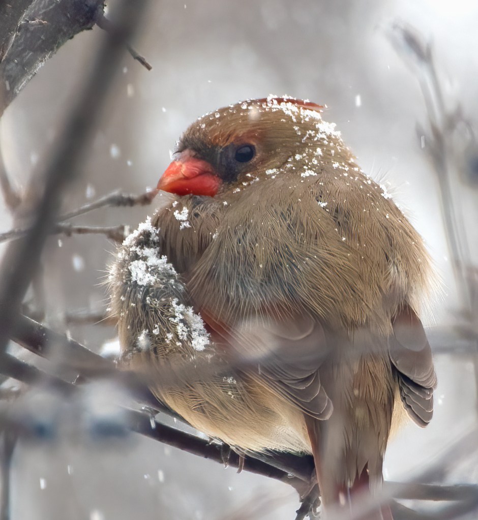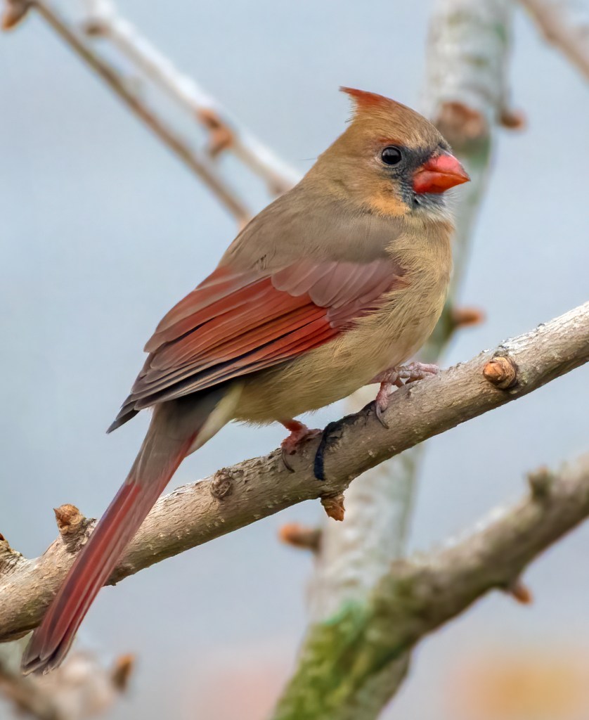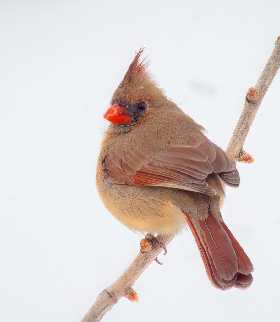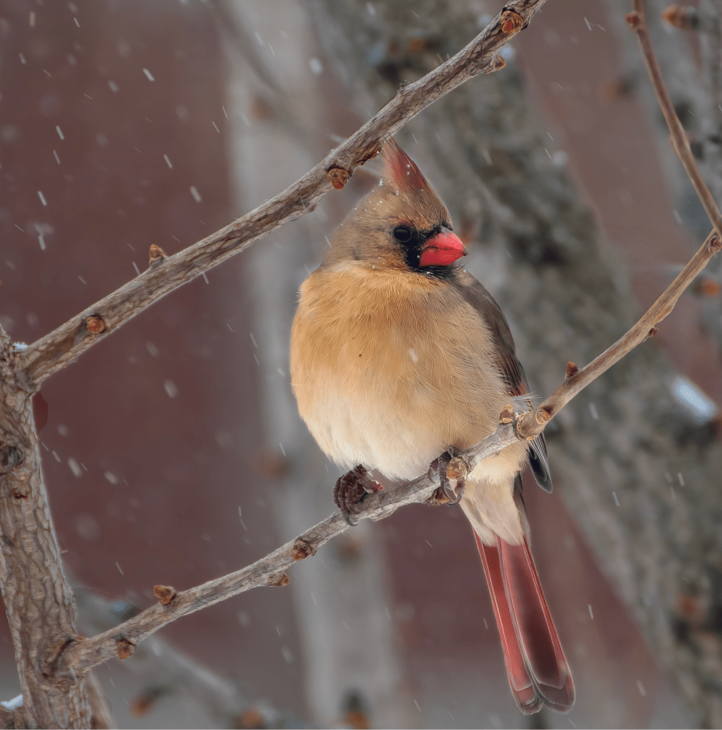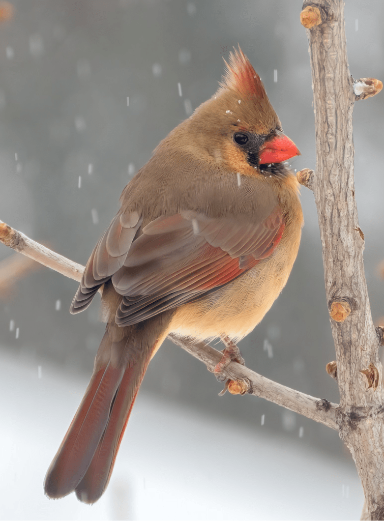 The female Northern Cardinal, adorned in a palette of subtle elegance, boasts a coat of soft russet hues that gracefully complements nature’s landscape. Her delicate plumage, tinged with warm reds and muted browns, whispers of quiet sophistication, a testament to the understated beauty woven into the fabric of the northern landscape.